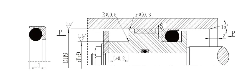 | Diyafram aralığı D H9 | Oluk çapı D H9 | Oluk genişliği L+0.2 | Mühür yüksekliği L1 | Yuvarlak köşeler Rmaksimum | Radyal temizlik smaksimum | Pah Zıplamin | O-ring teli çapı DO | |